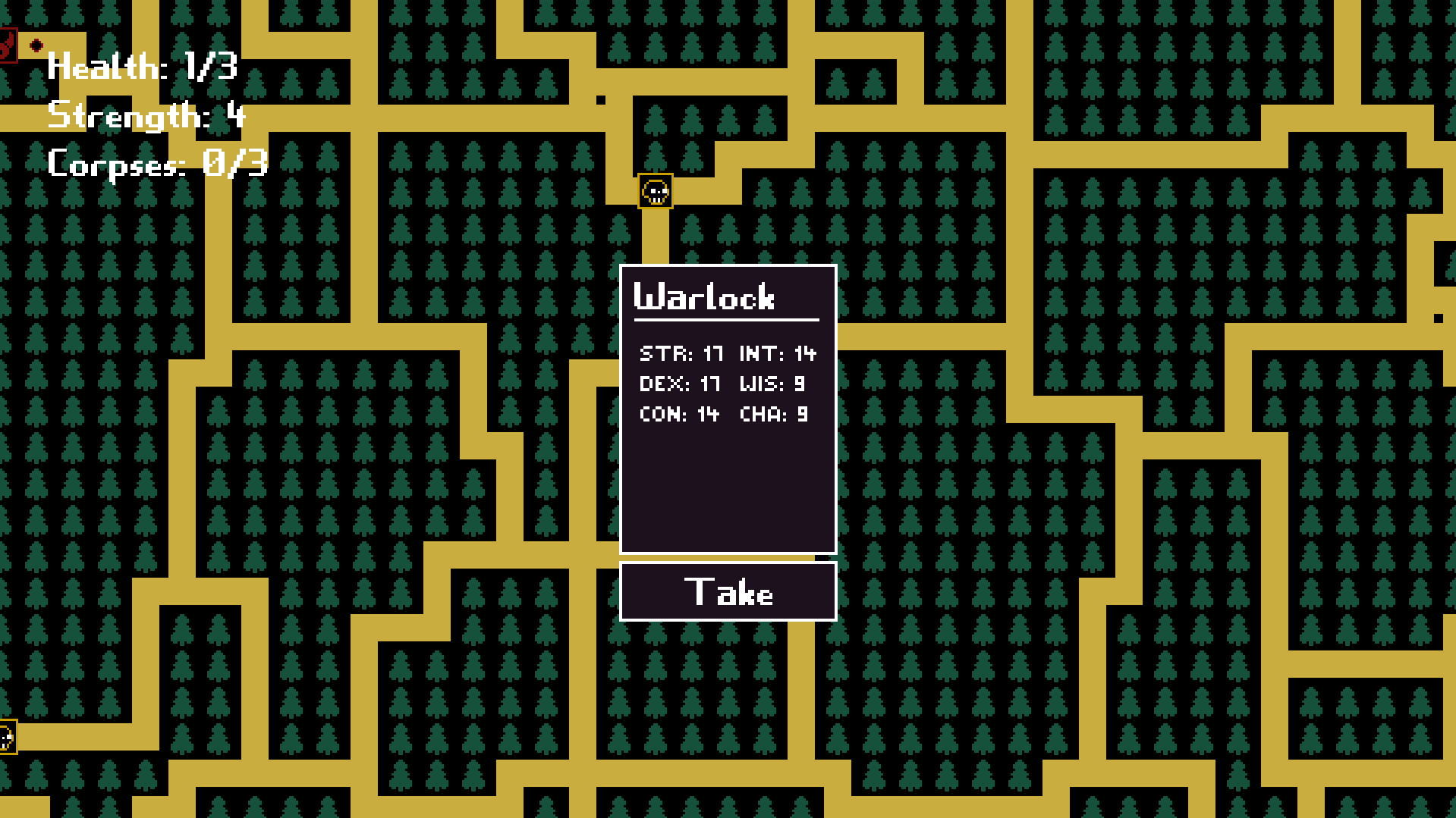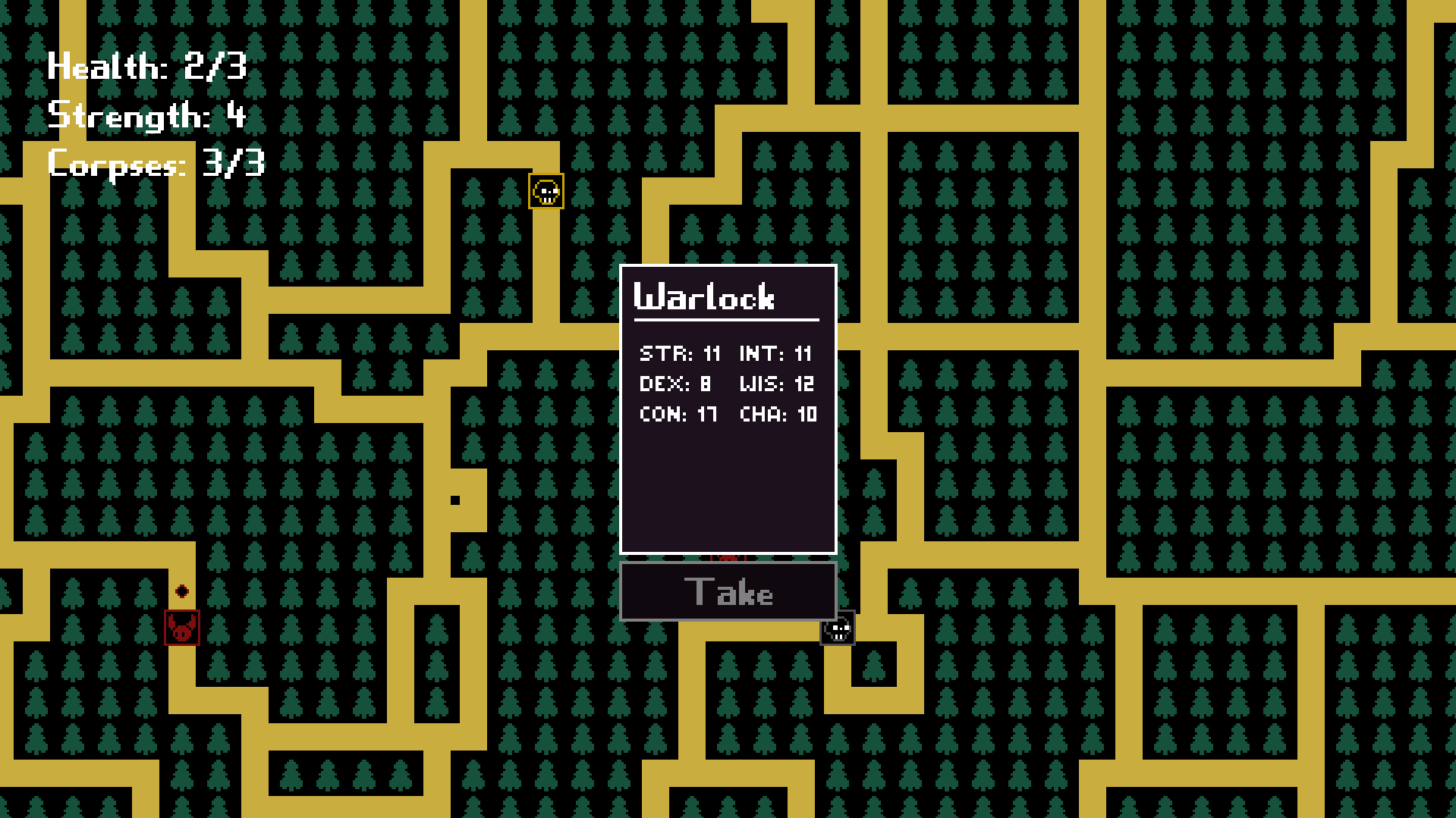 Also, I am just thinking about the 'lore' behind the game mechanics. When the player runs out of health, I don't want them to die and have to restart. I think maybe it would be better if the monsters just took the opportunity to eat the corpses they had picked up and leave the player, maybe because they are some sort of being that doesn't appeal to them. At that point, I could also just remove health and every time the player is attacked, there is a percentage chance for them to lose one of their corpses, based on the relative strength levels. Or I could just remove strength as well and have a flat rate.